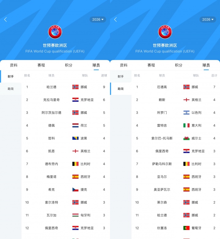 世欧预球员数据榜上,哈兰德9球领跑射手榜,比第二克拉马里奇多3球,厄德高7助攻领跑助攻榜,比第二赖斯多3次助攻。